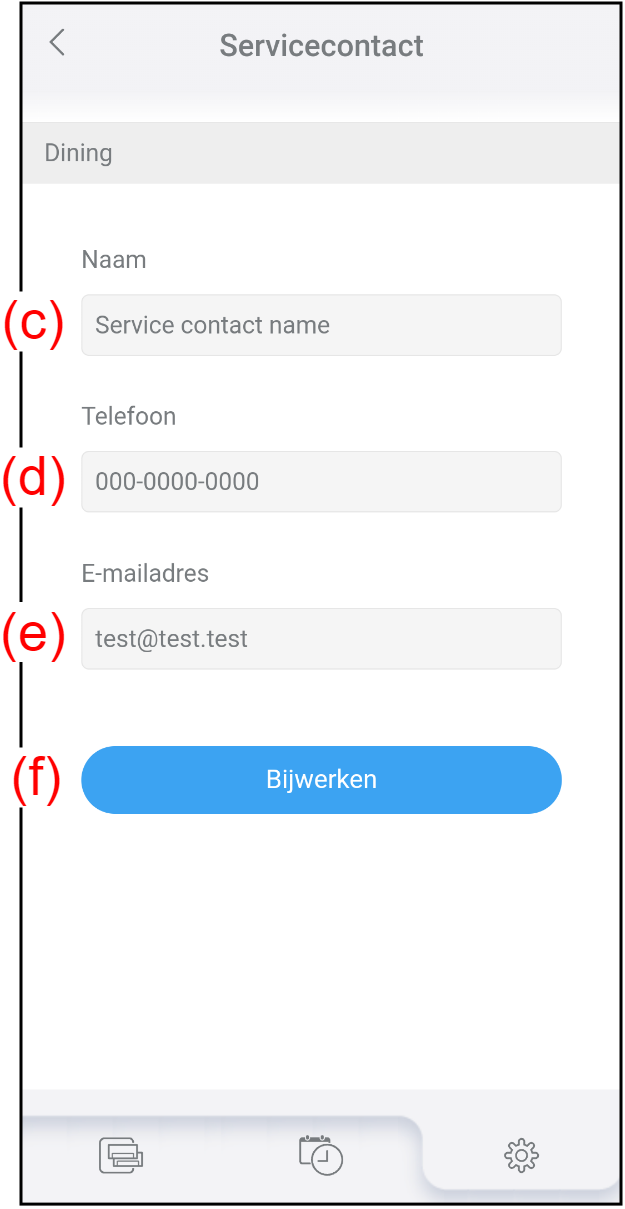 (d) Telefoon Voer het telefoonnummer van het servicepersoneel of het bedrijf in. (e) E-mailadres Voer het e-mailadres in van het servicepersoneel of het bedrijf.
