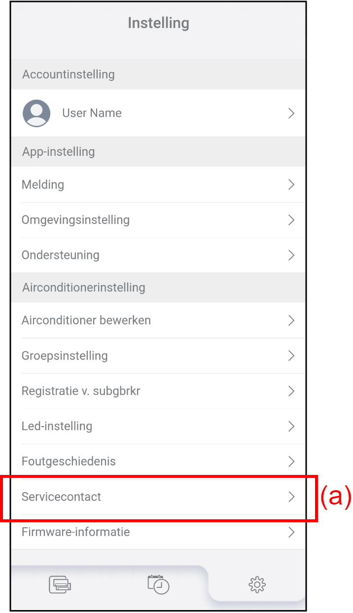 - Tik op (b) om de airconditioner te selecteren om de informatie op het servicecontact te controleren of te bewerken.