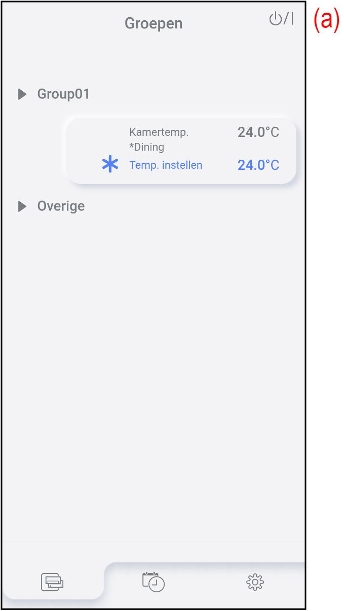 | (c) | Huidige status | Het geeft de huidige status van de groep weer. Tik hier om alle airconditioners in de groep te bedienen. Verwijs naar "Bedieningsinstelling voor de groep" voor details. |
