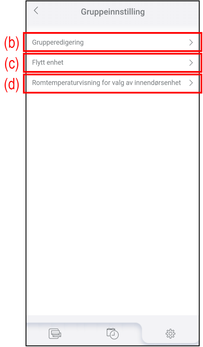 (b) Grupperedigering Trykk for å opprette en ny gruppe, redigere gruppenavnet eller slette gruppen. Se «Group editing (grupperedigering)» for detaljer. (c) Flytt enhet Trykk for å flytte klimaanlegg til en annen gruppe.