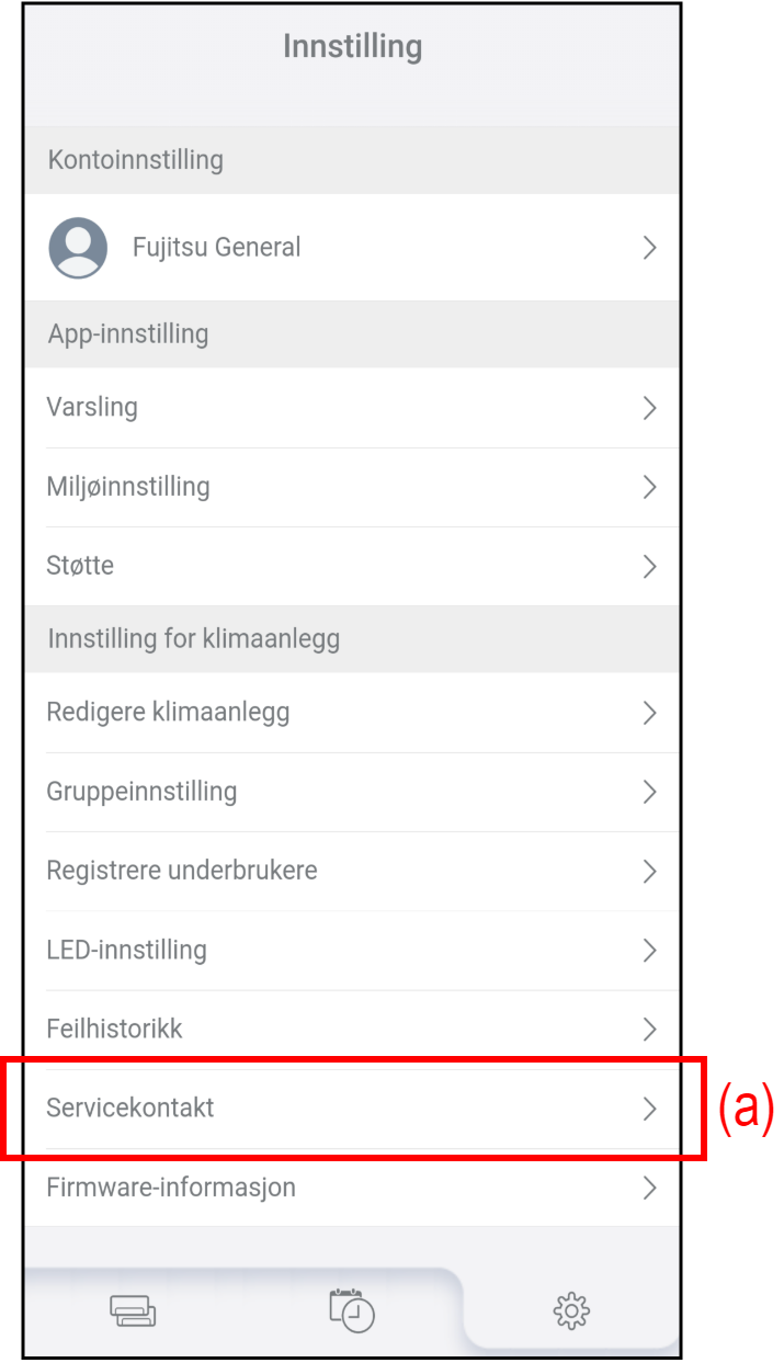 - Trykk på (a) på «Innstilling»-skjermen for å sjekke eller redigere informasjonen om servicekontakt.