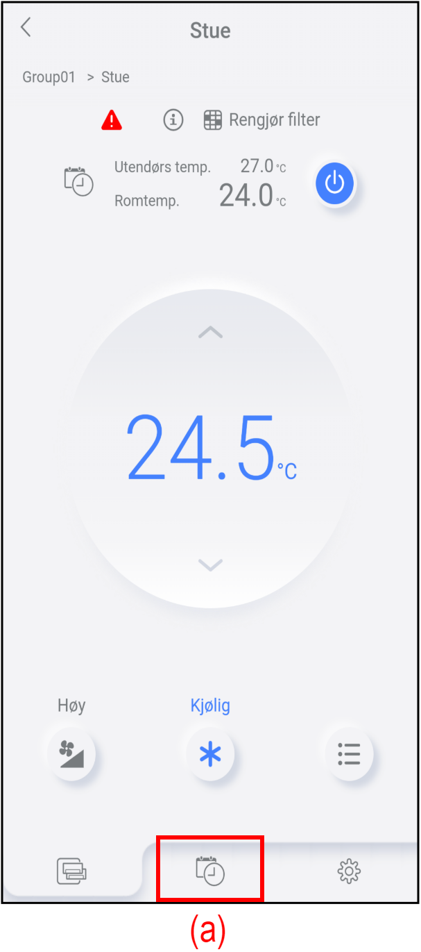 Trykk på (b) for å sjekke eller redigere innstillingene for ukentlig timer. Se «Prosedyre for innstilling av timer» for mer informasjon.