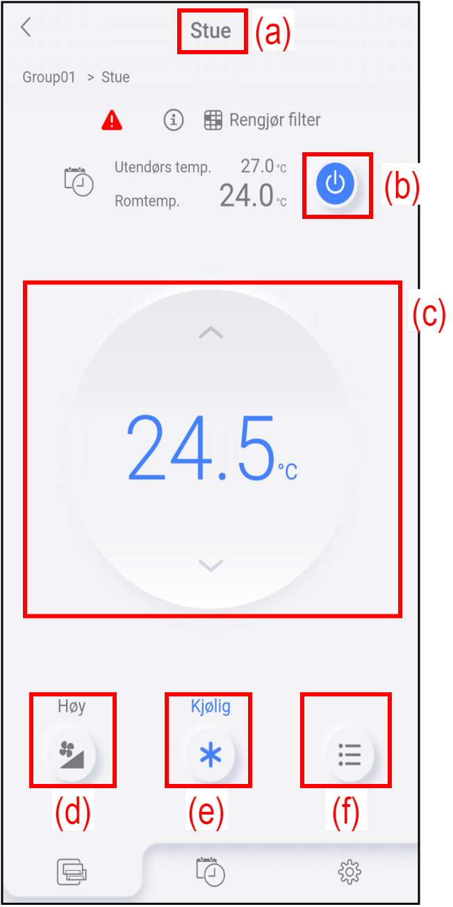 | (a) | Gruppenavn | Viser gruppenavnet som inkluderer klimaanlegget. Hvis det ikke er noen angitt gruppe, vises ikke dette elementet.  |