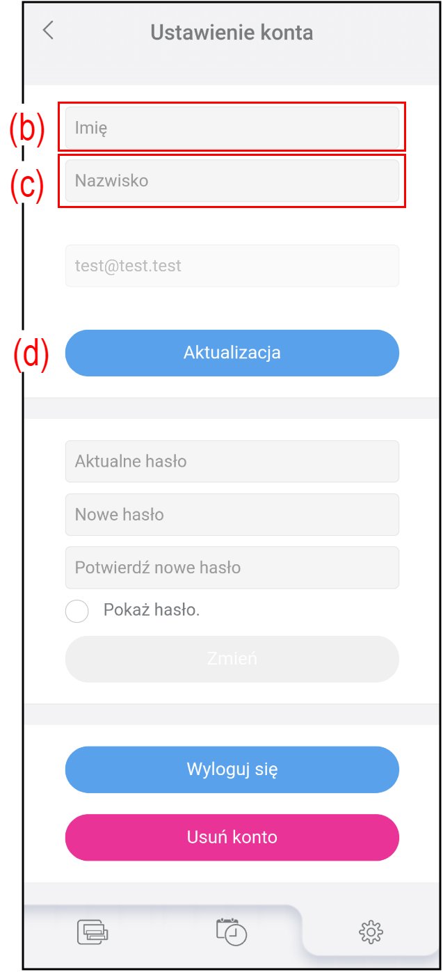Aby usunąć konto z tej aplikacji i serwera AIRSTAGE Cloud, dotknij przycisku (c).