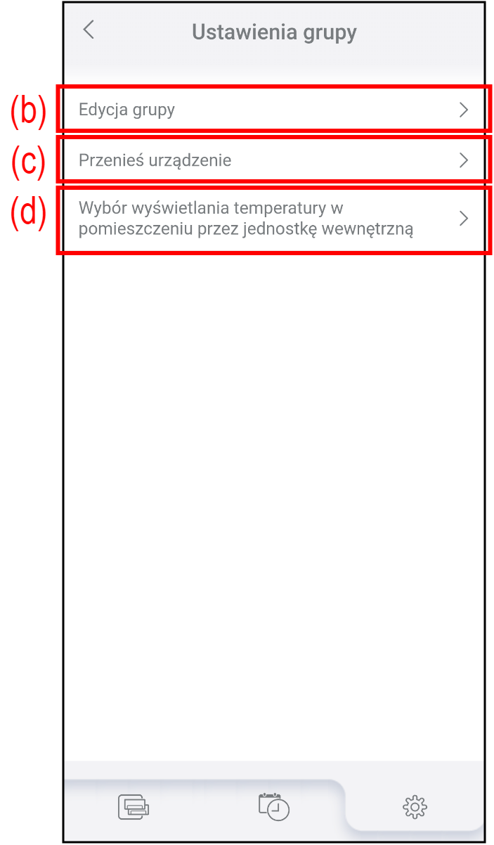 (b) Edycja grupy Dotknij, aby utworzyć nową grupę, edytować nazwę grupy lub usunąć grupę. Szczegóły, patrz „Edycja grupy”. (c) Przenieś urządzenie Dotknij, aby przenieść klimatyzator do innej grupy.