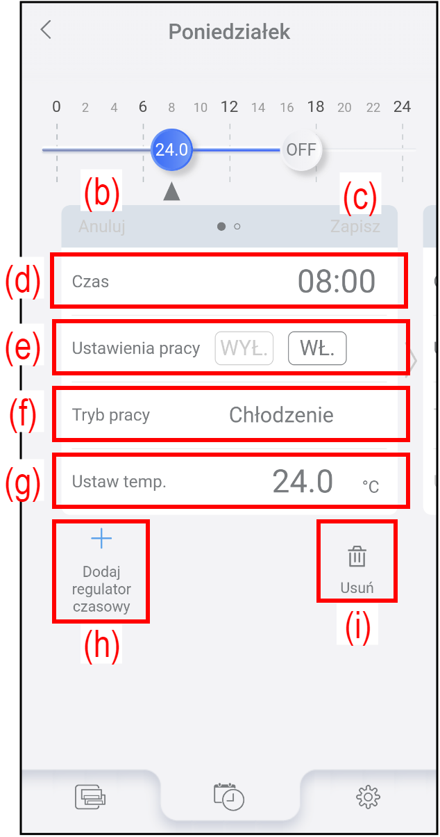 Aby dodać nowe ustawienia regulatora czasowego, dotknij (h). Pojawi się ekran edycji regulatora czasowego dla nowego regulatora czasowego. Skonfiguruj ustawienia regulatora czasowego od (d) do (g), a następnie dotknij opcji (c), aby zapisać ustawienia regulatora czasowego.
