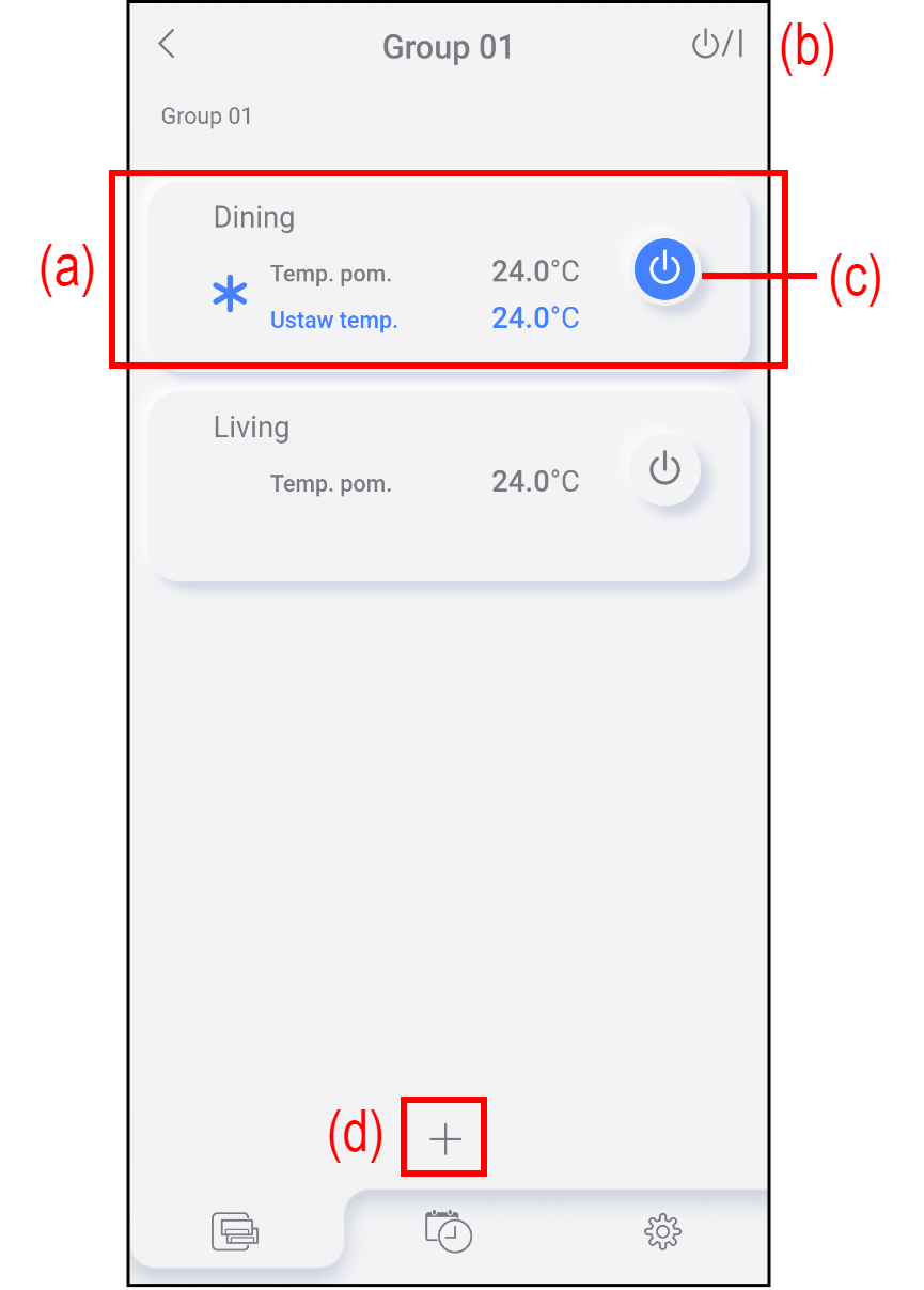 Dotknij (d), aby zarejestrować nowy klimatyzator. Szczegółowe informacje znajdziesz w sekcji „REJESTRACJA KLIMATYZATORA”.
