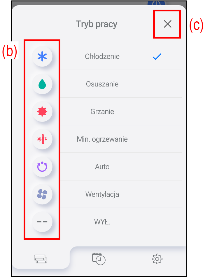 Aby zmienić tryb pracy, dotknij przycisku (a).
