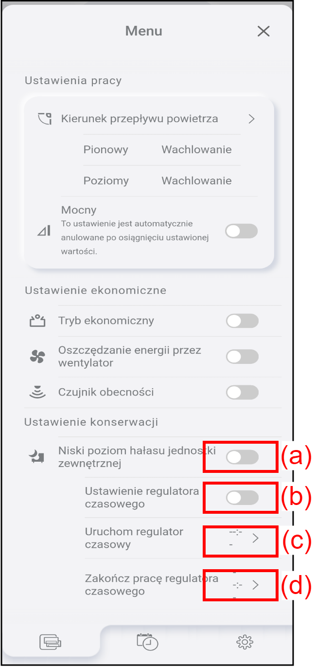 | (d) | Zakończ pracę regulatora czasowego | Stuknij, aby ustawić czas zakończenia regulatora czasowego niskiego poziomu hałasu jednostki zewnętrznej. Funkcja niskiego poziomu hałasu jednostki zewnętrznej jest zatrzymywana o ustawionym czasie. |