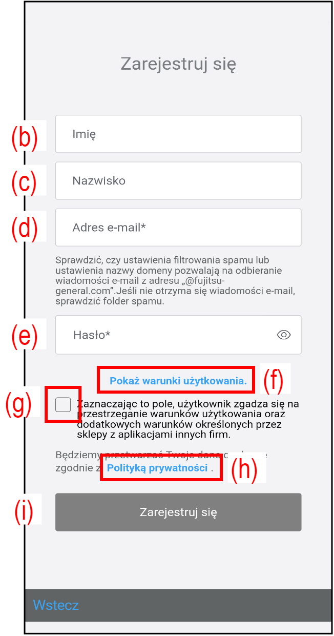 - Dotknij pole wyboru (g), aby zgodzić się na Warunki użytkowania.