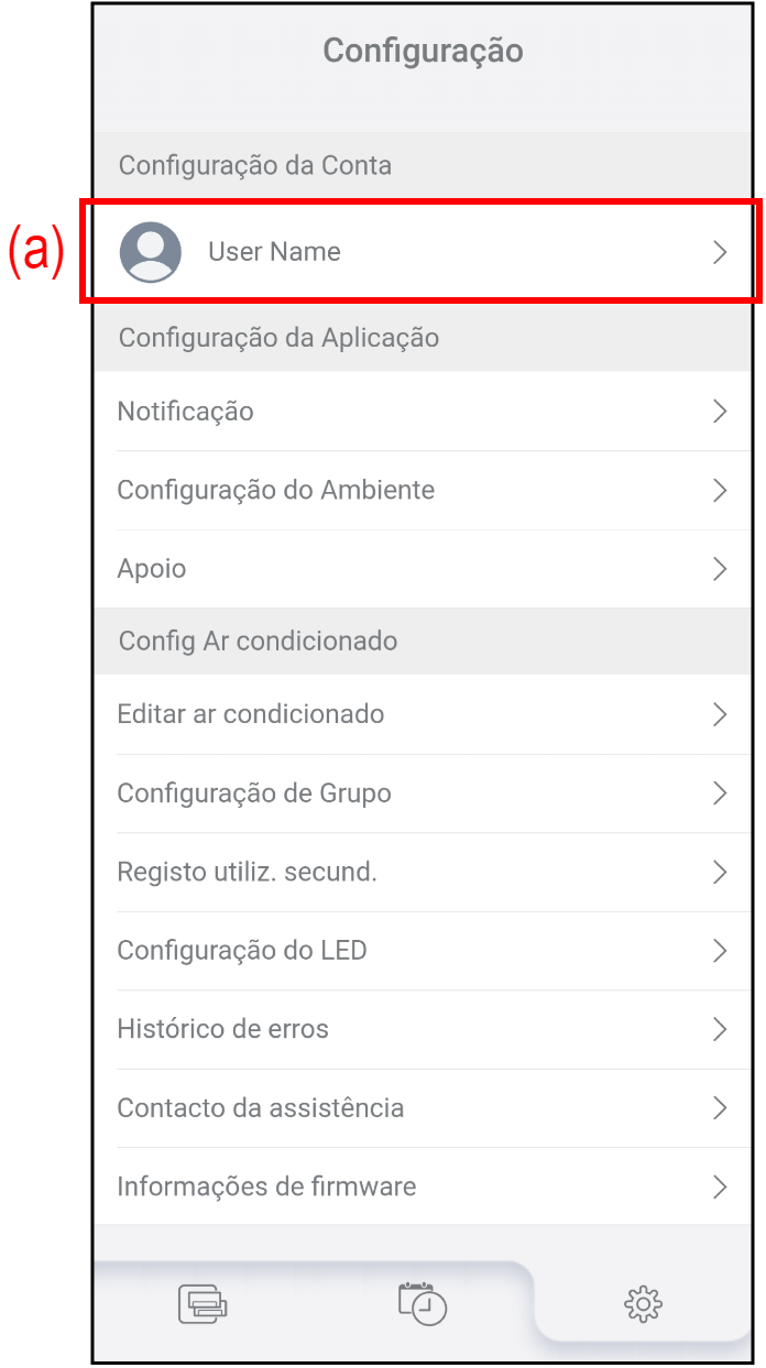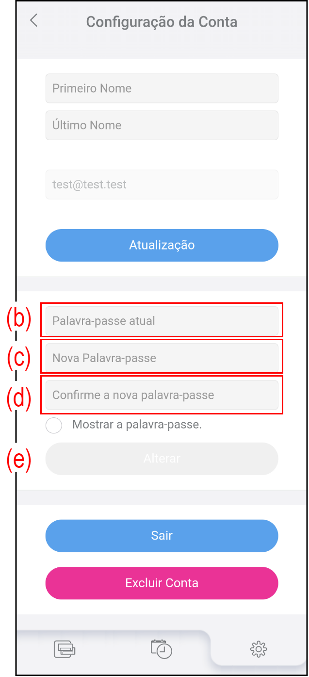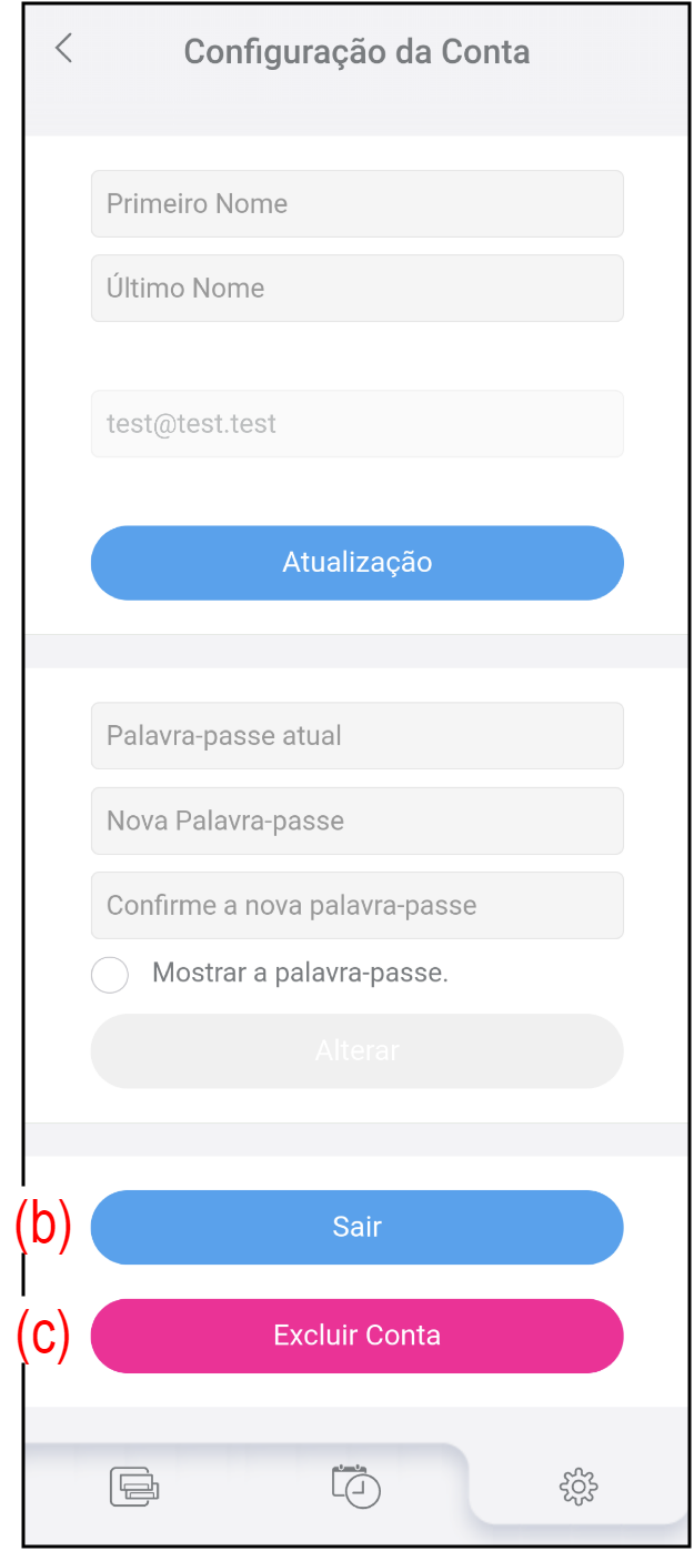 Toque em (a) no ecrã "Configuração" para alterar as informações e a palavra-passe da sua conta.