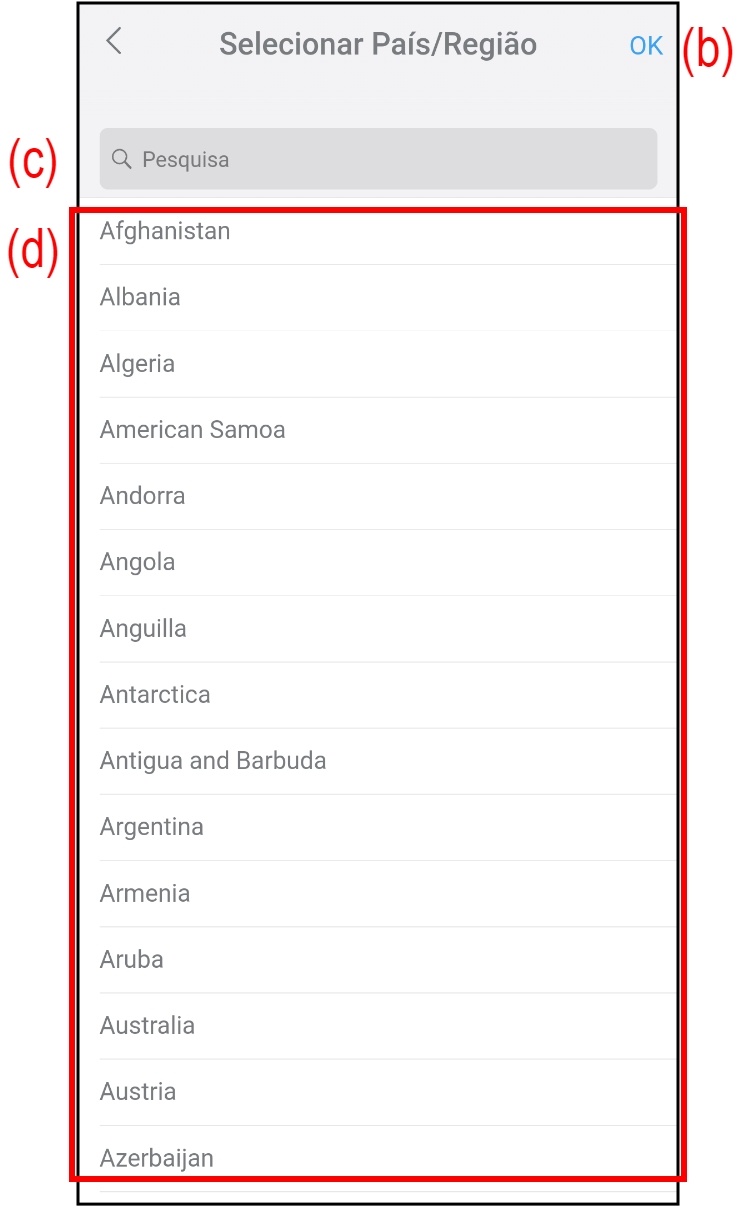 - Selecione o seu país/a sua região na lista (d). Pode procurar o país/a região em "Pesquisa" (c).