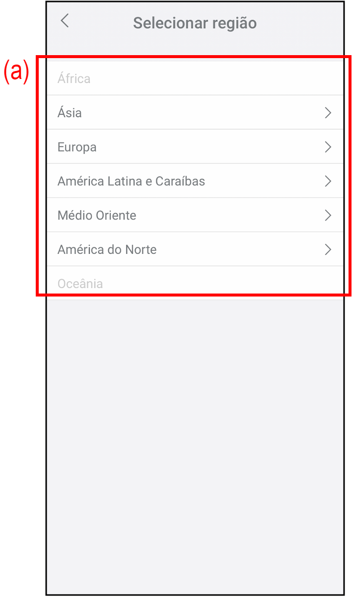 O ecrã muda para "Selecionar País/Região", e é apresentada uma lista de países/regiões que pertencem à região selecionada.