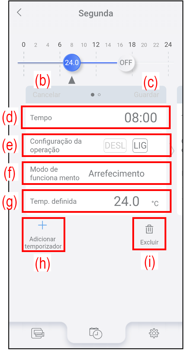 <Itens de configurações>(d) Tempo Defina o horário de funcionamento do temporizador. (e) Configuração da operação DESL: O aparelho de ar condicionado para de funcionar nesse horário.