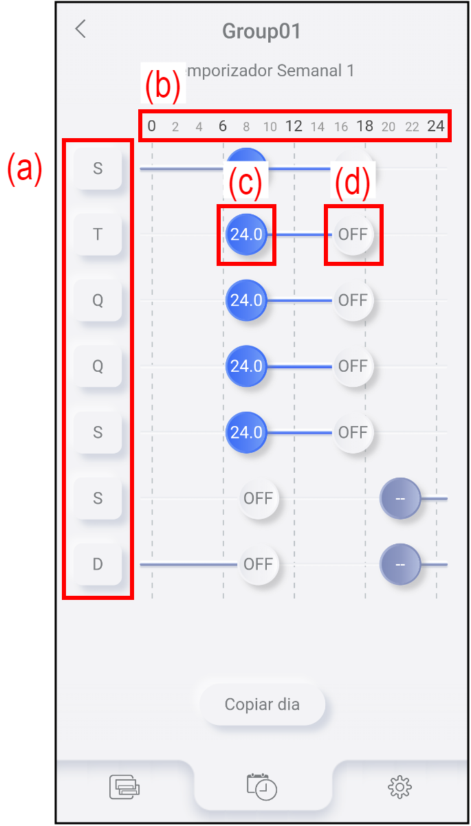 | (a) | Dia da semana | Indica o dia da semana (Segunda a Domingo). |