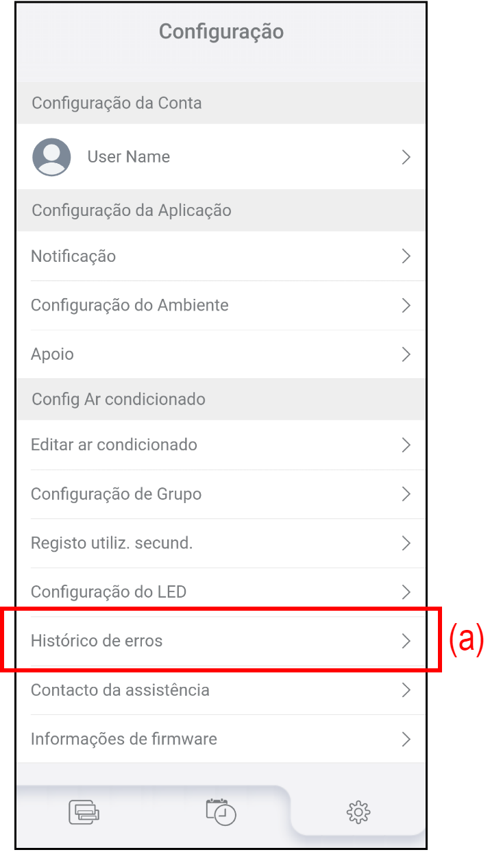 - Toque em (b) para selecionar o aparelho de ar condicionado e verificar o histórico de erros.