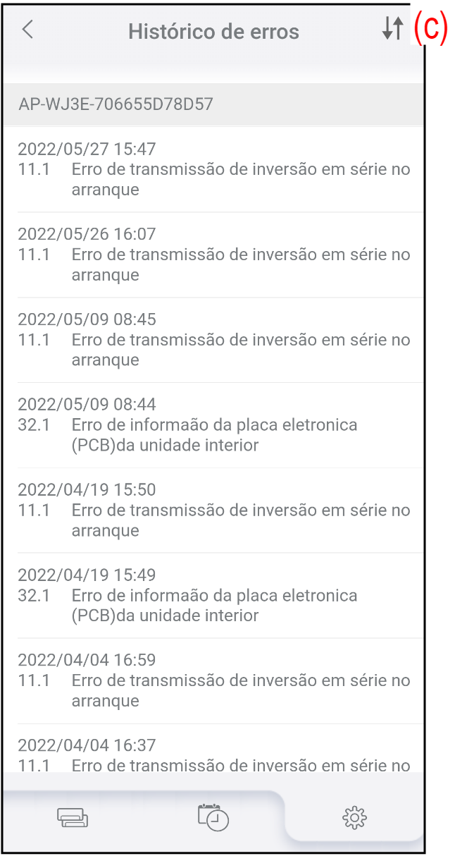 - O histórico de erros do aparelho de ar condicionado é apresentado a começar pelo mais recente e até ao mais antigo.