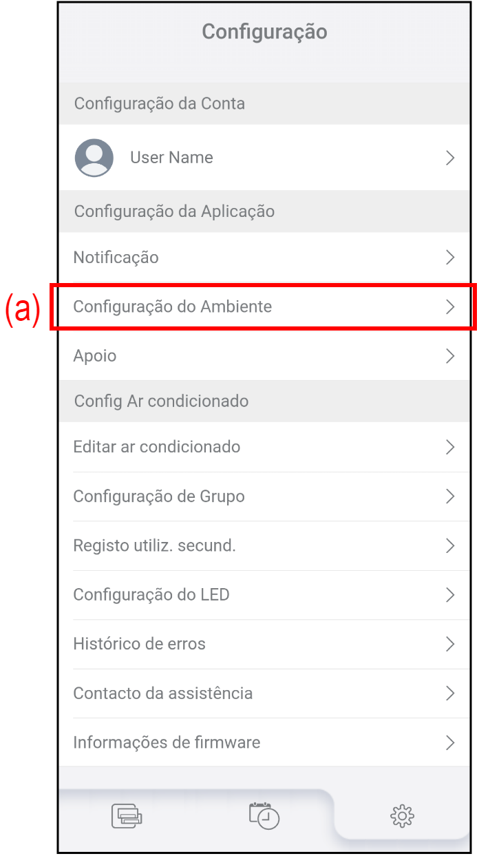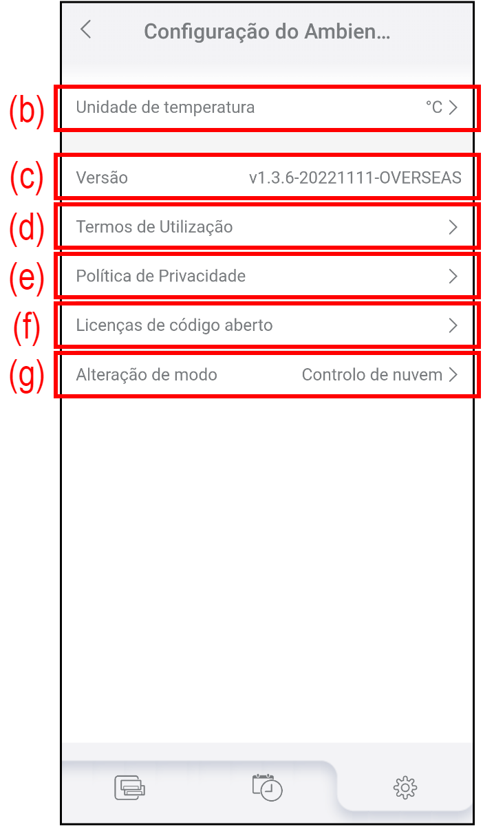 (c) Versão Indica a versão atual da AIRSTAGE Mobile. (d) Termos de Utilização Toque aqui para verificar os Termos de Utilização mais recentes da AIRSTAGE Mobile. (e) Política de Privacidade Toque aqui para verificar a Política de Privacidade mais recente da AIRSTAGE Mobile. (f) Licença de fonte aberta Toque aqui para verificar as licenças de fonte aberta utilizadas na AIRSTAGE Mobile. *As licenças de fonte aberta são apresentadas apenas em inglês. (g) Alteração de modo Toque para alternar o modo de controlo (Controlo de nuvem ou Controlo direto.)