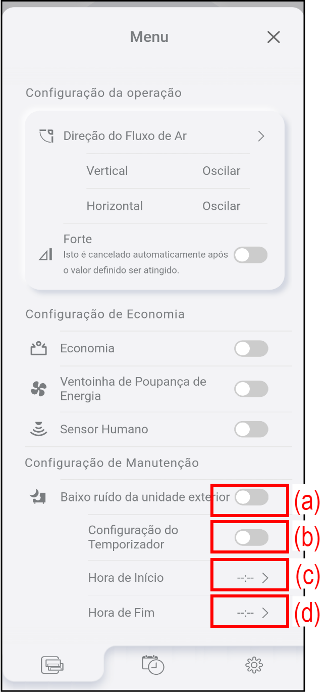 | (b) | Configuração do Temporizador | Toque aqui para ativar/desativar o temporizador Baixo ruído da unidade exterior. |