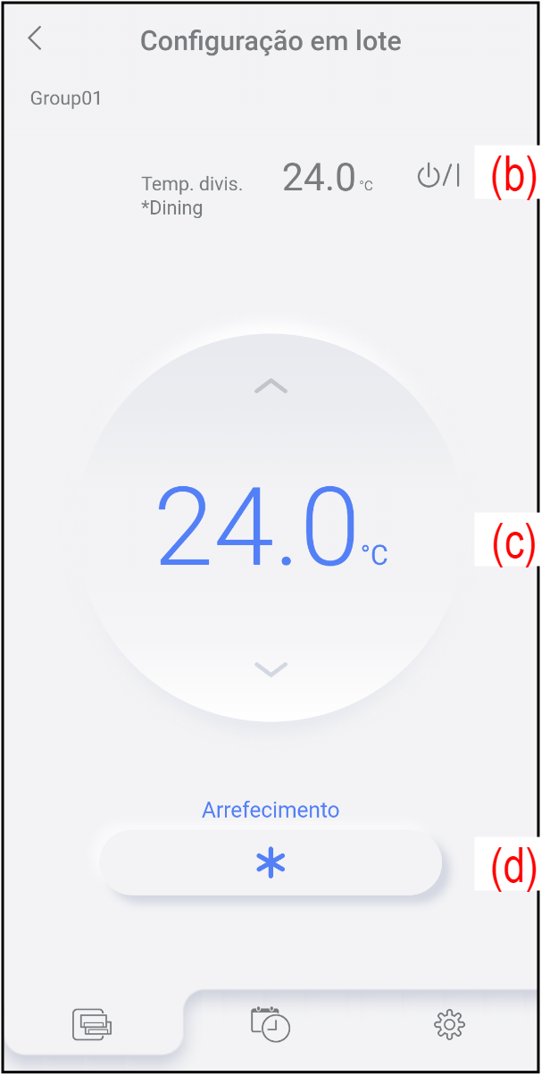 (b) Iniciar/parar Para iniciar/parar o funcionamento, toque aqui. (c) Temp. definida Para alterar a temperatura definida, toque em [