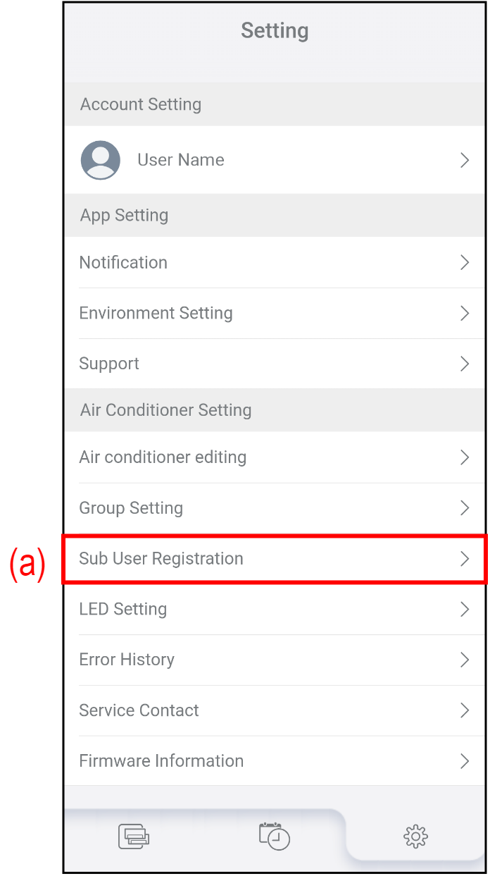 Pentru a înregistra un nou subutilizator, atingeți (d). Consultați „Sub-user registration (Înregistrare utilizator secundar)” mai jos pentru procedurile următoare.
