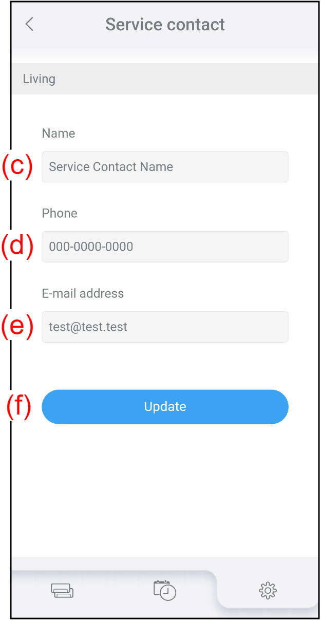 (d) Phone Introduceți numărul de telefon al persoanei de contact sau al societății de service. (e) E-mail address Introduceți adresa de e-mail a persoanei de contact sau a societății de service.
