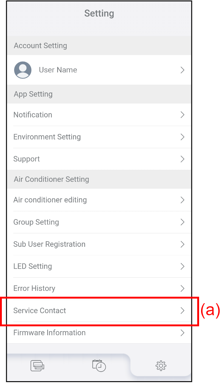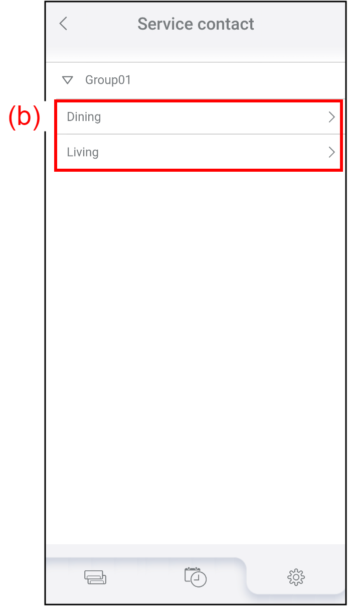 - Atingeți (b) pentru a selecta aparatul de aer condiționat la care verificați sau modificați informațiile privind persoana de contact pentru service.