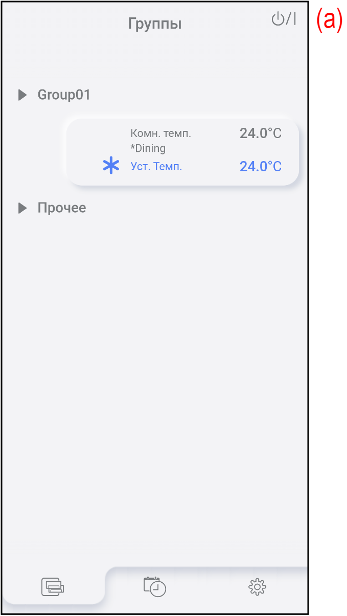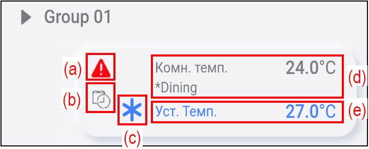| (d) | Комн. темп. | Здесь отображается представительный кондиционер воздуха и температура в помещении, измеренная этим кондиционером. Вы можете установить внутренний блок-представитель на вкладке «Настройки» > «Настройка группы» > «Выбор отображения температуры внутреннего блока». |