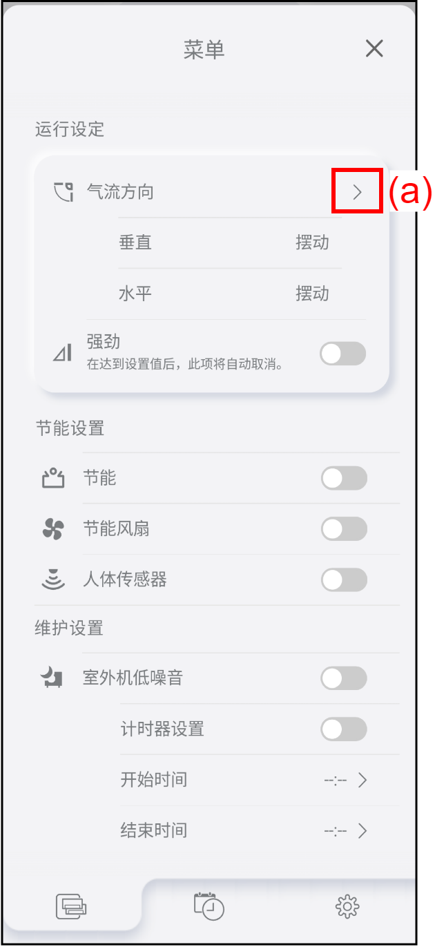 主页 主菜单 各空调画面 功能设置 运行设定 气流方向设置 注: 取决于空调,左/右气流方向设置不可用。 将运行模式更改为自动时,更改气流方向设置之前请等待3分钟。在自动模式下,空调开始监控以确定适当的运行模式。监控操作期间更改气流方向可能会导致故障。 轻按(a)以调整上/下或左/右气流方向。 轻按(b)以调整气流方向。轻按(c)以开始/停止摆动运行。 强劲运行 注: 取决于空调,可能不会出现在画面上。 轻按(a)以开始/停止强劲运行。 室内温度达到设定温度后,强劲运行自动关闭。
