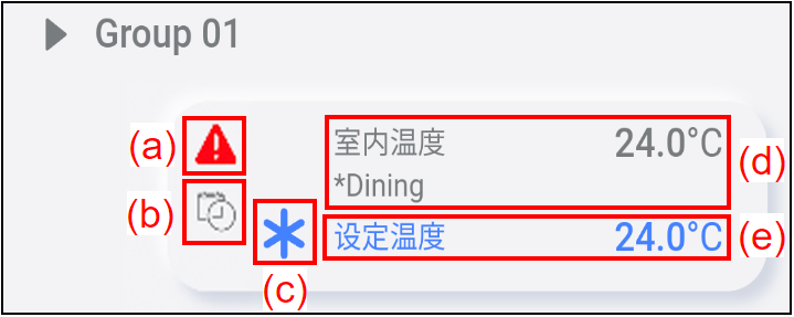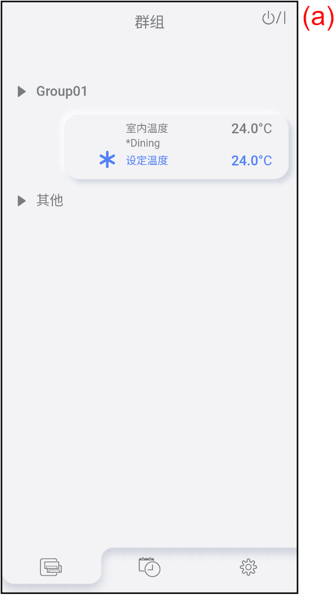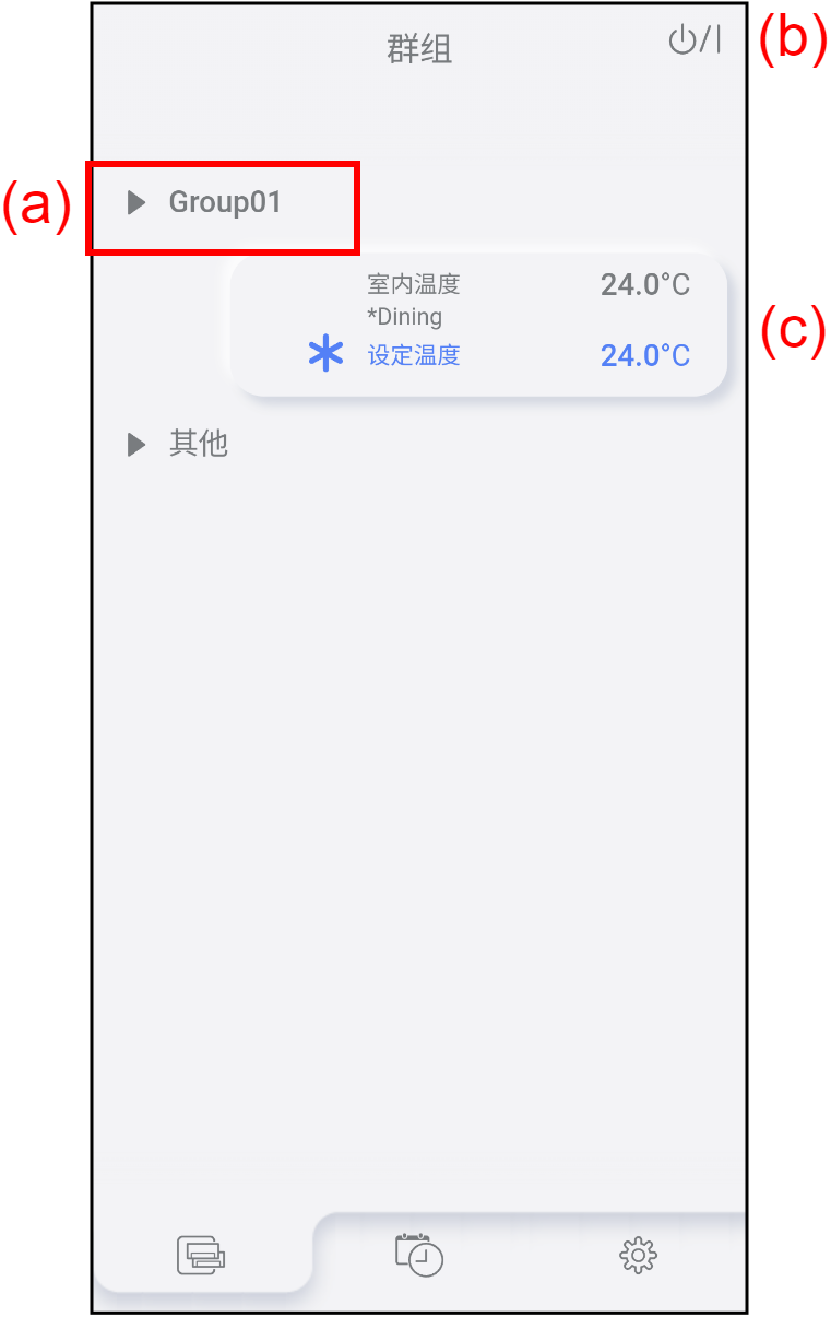 | (a) | 群组名称 | 若要检查群组中的空调列表,轻按此处。 参考“空调列表画面”了解详情。  |