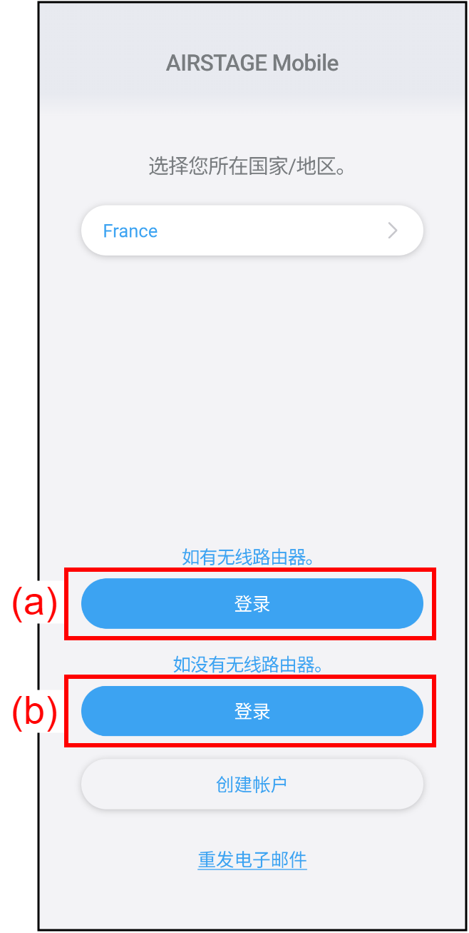 主页 启动本应用程序 登录 轻按[登录] (a)或[登录] (b)以显示登录画面。* 如果您有无线路由器,轻按[登录] (a)。* 如果您没有无线路由器,轻按[登录] (b)。 使用您已注册的电子邮箱地址(c)和密码(d)登录。 如果您有接入点,轻按(e)登录至本应用程序。如果您没有接入点,使用直接控制。参考“直接控制”了解详情。 注: 请勿同时从多台智能手机登录到一个帐户。登录会失败。 如果30天未使用本应用程序,您将自动登出。遵照画面上的指示,再次登录。* 即使您经常使用AIRSTAGE Mobile应用程序,您也会在初次登录一年后自动登出。 如果忘记密码,请参考“遗忘密码时”。