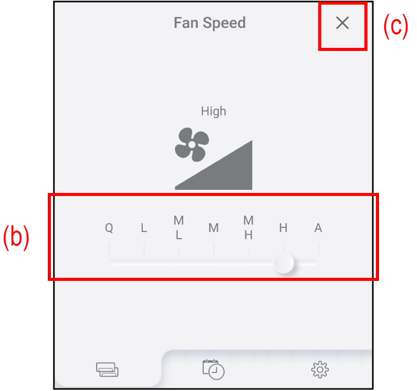 Na nastavenie rýchlosti ventilátora posúvajte panel (b).