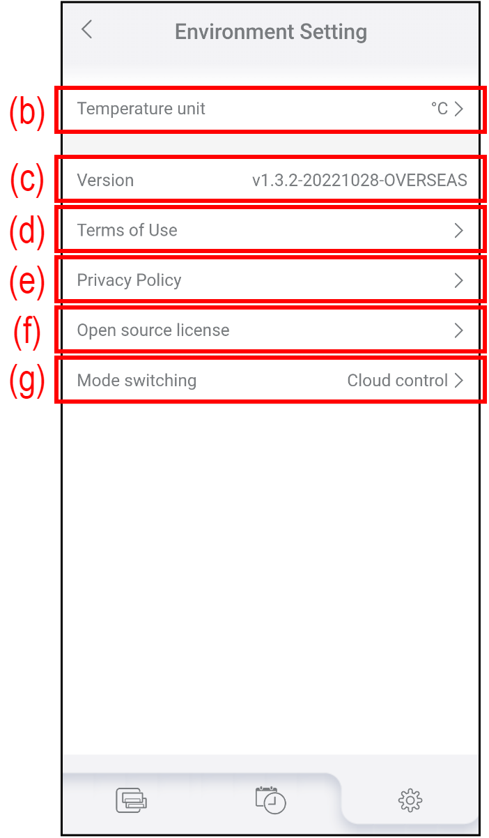 (c) Version Prikazuje trenutno različico aplikacije AIRSTAGE Mobile. (d) Terms of Use Tapnite, da preverite najnovejše pogoje uporabe za AIRSTAGE Mobile. (e) Privacy Policy Dotaknite se, da preverite najnovejši pravilnik o zasebnosti za AIRSTAGE Mobile. (f) Open source license Dotaknite se, da preverite odprtokodne licence, ki se uporabljajo v AIRSTAGE Mobile. *Odprtokodne licence so prikazane samo v angleščini. (g) Mode switching Tapnite za preklop načina upravljanja (Upravljanje v oblaku ali Neposredno upravljanje.)
