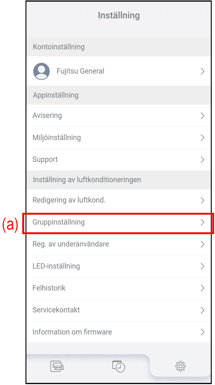 (b) Gruppredigering Tryck för att skapa en ny grupp, redigera gruppnamnet eller ta bort gruppen. Se ”Group editing (Gruppredigering)” för mer information. (c) Flytta enhet Tryck för att flytta luftkonditioneringsapparater till en annan grupp.
