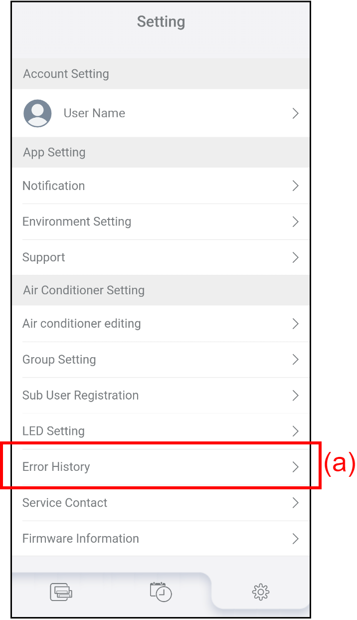 - แตะ (a) บนหน้าจอ “Setting” เพื่อตรวจเช็คประวัติข้อผิดพลาด