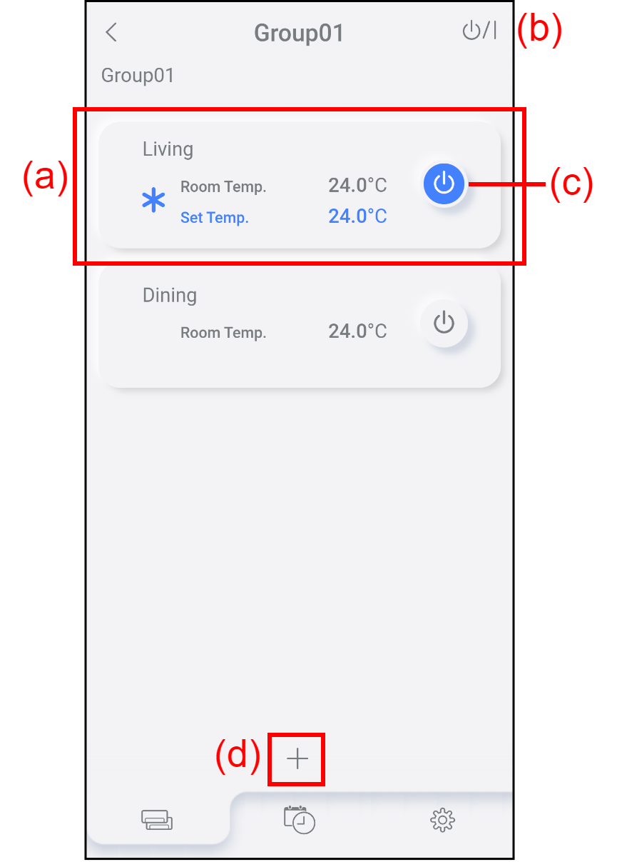 แตะ (d) เพื่อลงทะเบียนเครื่องปรับอากาศเครื่องใหม่ ดูรายละเอียดเพิ่มเติมได้ที่ “การลงทะเบียนเครื่องปรับอากาศ”
