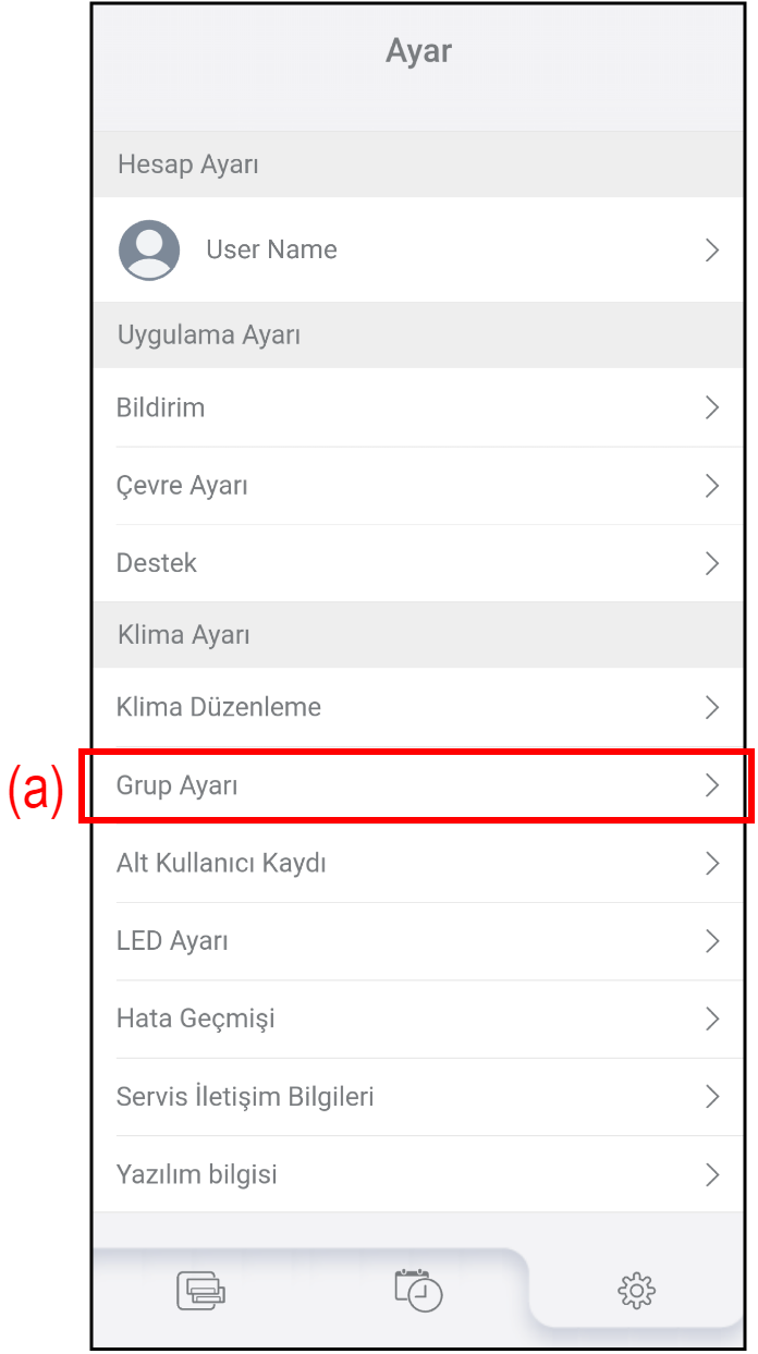 (b) Grup Düzenleme Yeni bir grup oluşturmak, grup adını düzenlemek veya grubu silmek için buna basın. Ayrıntılar için bkz. “Grup düzenleme”. (c) Cihazı Taşı Klimaları başka bir gruba taşımak için buna basın.