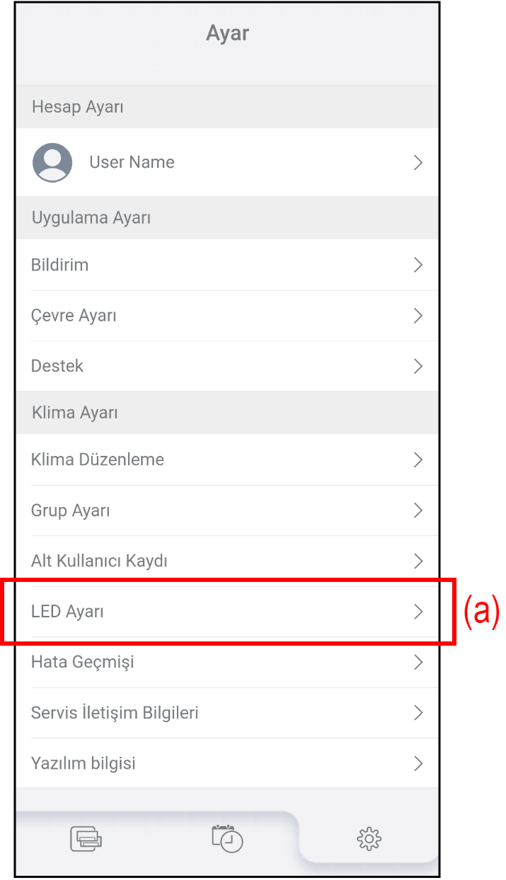 - LED ayarını değiştirmek için "Ayar" ekranındaki (a) düğmesine basın.