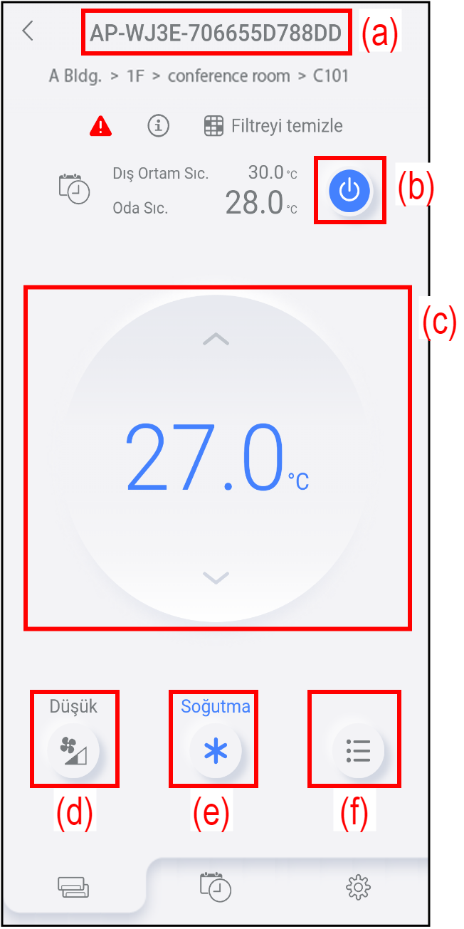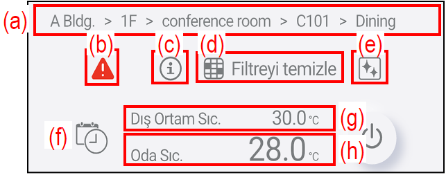 | (d) | Fan hızı ayarı | O sıradaki fan hızını gösterir. Fan hızı ayarını değiştirmek için bu simgeye dokunun. (“Fan hızı ayarı” bölümüne bakın.) |