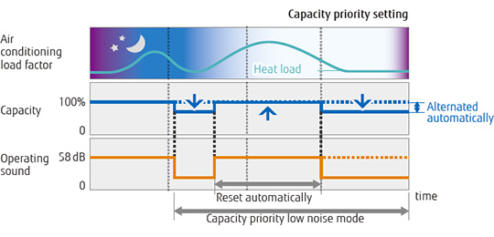 Operation capacity can be reduced in 5 steps from the rated capacity. This mode cuts down on peak power consumption and eases the maximum load on the unit.