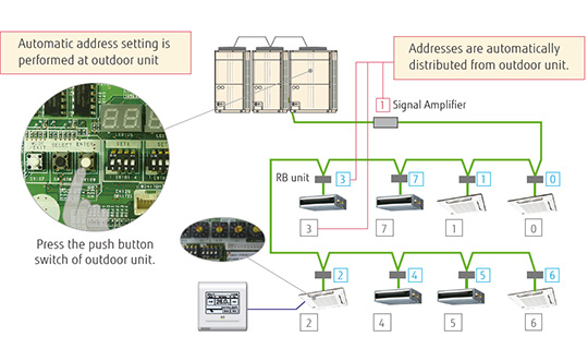 Addresses of connected indoor units, RB Units, and Signal Amplifier can all be set automatically from the PCB in the outdoor unit.