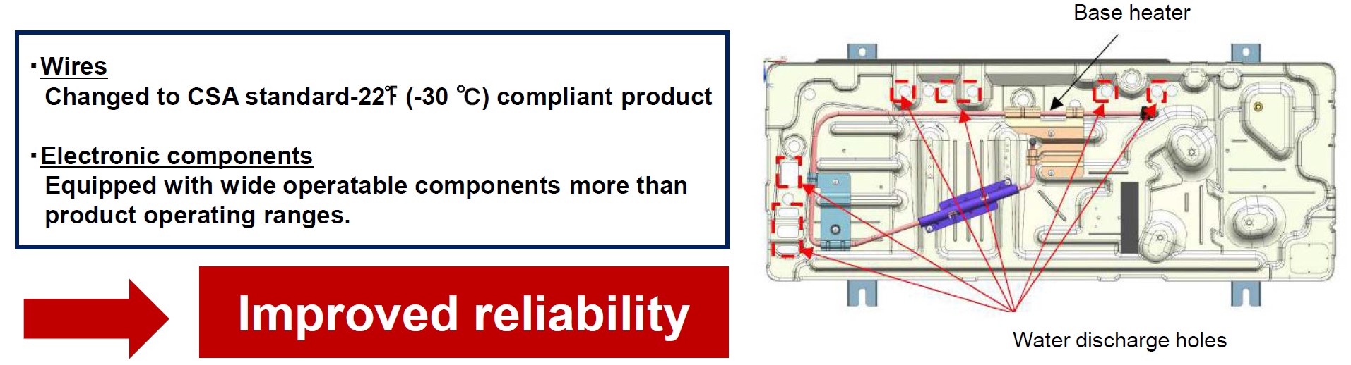 Base heater is added to prevent drain water from freezing under low outdoor temperature. More water discharge holes are added to the base pan to prevent water accumulation inside chassis base.