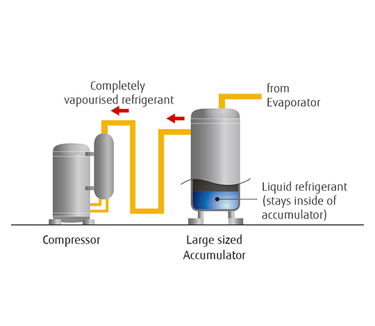 A large accumulator captures not-yet vaporized refrigerant to prevent liquid refrigerant from being fed into the compressor.