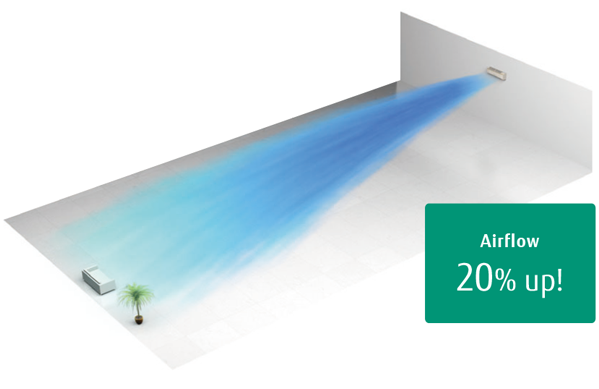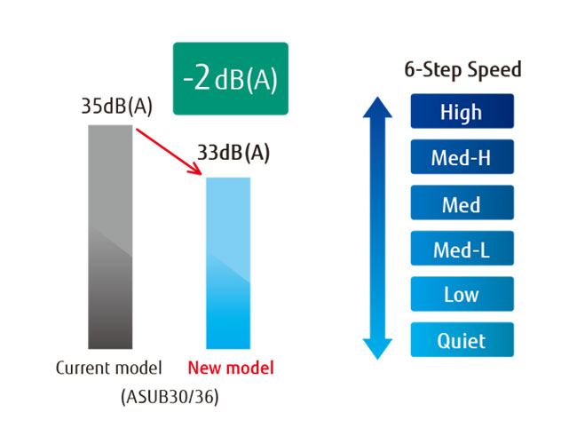 Drastic low noise is realized by new airflow structure. In addition, multistep quiet operation is available by 6-step sound level settings.