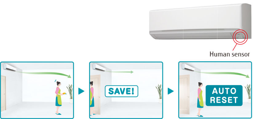 Automatically saves energy by detecting occupancy if unit is left on and room becomes unoccupied. The wasteful consumption of energy is reduced automatically to keep down electricity bills.